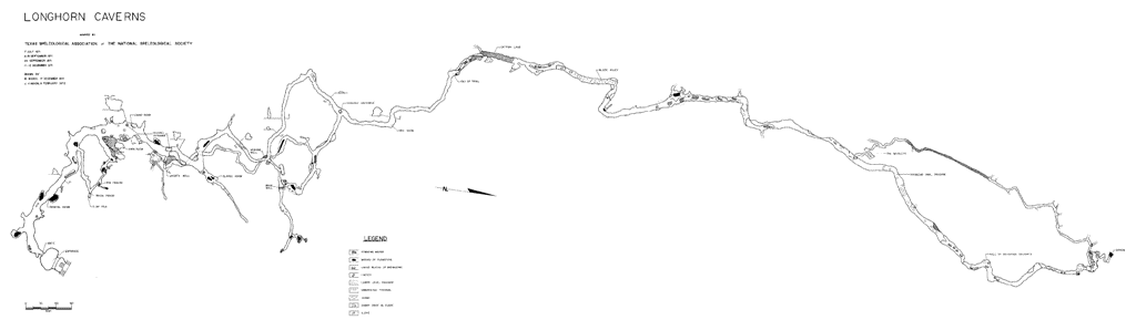 Directions: From Marble Falls go north from the bridge over the Colorado River (Lake Marble Falls) on 281 for about 8.5 miles, watching for cavern signs. Turn left (west) on Park Road 4, and drive 6 miles to Longhorn Cavern State Park headquarters. The road continues 4 miles to Inks Lake State Park. Burnet is another 3 miles north on U.S. 281. Description: Longhorn Cavern has few formations but lovely wall sculpting and large calcite crystals. At different times the cave was a Comanche hideout, a black powder factory, a dance hall, a restaurant, and a church. Longhorn Cavern is formed in a fault block of the Ordovician-age Ellenburger Limestone on a plateau called Backbone Mountain. The cave is oriented north-south and exhibits a dendritic and meandering stream pattern, which drains to the south. Passages average 7 m wide and 2 to 7 m high. The cave has a large walk-in entrance and three vertical entrances. The large entrance that once led into the Lunchroom area has been artfully sealed. About 90% of the known cave is mapped. Most of the unmapped stream passages are accessible only during very dry weather. Eyed crayfish inhabit the cave stream-they are pale but not cave-adapted. The trail traverses about 25% of the known passage. Paleontological deposits in the cave were studied by Semken (1961), and included three bone-bearing units going back to the late Pleistocene (see Toomey's chapter on paleontology in this volume). Once upon a time Comanches kidnapped a young woman named Mariel King and brought her to the cave. They were followed by three Texas Rangers, who fired on them, grabbed Mariel, and made for the entrance. The Comanches counterattacked, and a hand-to-hand battle ensued. The Rangers escaped with Mariel, who later married one of her rescuers, Logan Van Deveer. Later, during the Civil War, Confederate Soldiers used the cave's main room as a gunpowder factory. Bat guano from the cave was used to make saltpeter for the black powder. Several other Texas bat caves were used to make black powder during that era. Additional small rooms in the back of the cave were used as gunpowder storerooms. Legend holds that Sam Bass, a notorious bandit, used the cave for his hideout in the 1870s. The current main entrance is named for him. In the 1920s a local businessman opened a dance hall in the largest room and built a wooden dance floor. He also opened a restaurant in the next room, lowering food through one of the pit entrances. A preacher built bleachers in the cave to accommodate his congregation for Sunday services. After the Depression struck, the owners sold the cave to the State Parks Board in 1931. The cave opened to the public in 1932. Various groups worked to make "improvements" in the cave, but most of the work was done by the Civilian Conservation Corps (CCC), one of President Franklin D. Roosevelt's innovations to help the unemployed during the Depression. Much of the cave at that time consisted of low crawlways, so the CCC had to excavate much of the fill. Artificial shafts were dug to facilitate the removal of the original floor deposits, mud, guano, and bone-laden clay. These were dug out or washed down with high-pressure hoses to the lower level. The original level of the clay floor can still be seen in several passages. Bats were driven out and are no longer present. A museum in the rustic old stone headquarters depicts the days of the CCC. The cave was used during the Cold War to store Civil Defense supplies as a potential fallout shelter. In 1989 the Texas Speleological Association held a volunteer cleanup project and removed the Civil Defense materials and an old photographic lab from the cave. A sinkhole that had been used for decades as a dump was cleaned up and many truckloads of trash hauled off. Bibliography: Elliott, W. R. 1992. Cave fauna conservation in Texas. 323-337 in Foster, D.G. (ed.). 1991 Natl. Cave Mgmt. Symp. Proc. Amer. Cave Consv. Assoc., Horse Cave, Kentucky. Fieseler, R. G. 1978. Cave and karst distribution of Texas. pp. 15-53 in Fieseler, R.G, J. Jasek, and M. Jasek. An Introduction to the Caves of Texas. NSS Conv. Guidebook, 19. Fralia, B. 1989. Longhorn Cavern cleanup project. Texas Caver, 34(5):103.1-103.2. Semken, H. A., Jr. 1961. Fossil vertebrates from Longhorn Cavern, Burnet County, Texas. Texas J. Sci., 13:290-310.