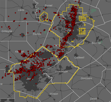 •GDOT_Georgetown_1997-99: Most of the the western half of Williamson Co. and parts of adjacent counties (16 7.5' quadrangles). •GDOT_Austin_2002: Central Travis County (about ten 7.5' quadrangles), mapped at scale 1:62,500. •GDOT_NewBraunfels_1997: Northern Bexar Co., all of Comal Co., and all but the northern third of Kendall Co. (32 7.5' quadrangles). •GDOT_DelRio_2001: An area surrounding Amistad Dam, Del Rio, and Laughlin AFB in Val Verde Co. (9 7.5' quadrangles).