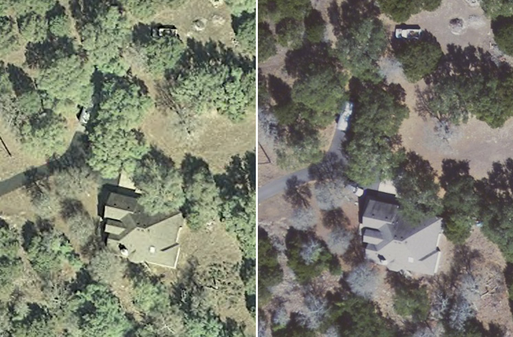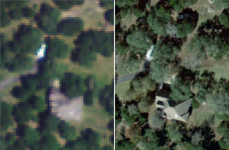 Below is a typical 60 m x 75 m aerial view, with CAPCOG's 2009 6-in imagery (top-left) alongside USGS 2006 6-in imagery for the Austin area (top-right). Note that CAPCOG's MrSID file contains artifacts from lossy compression whereas the USGS TIFF file is uncompressed and has a better color range. (Both are shown at 100% zoom.) The bottom two images show the 0.50-meter DOQQ available at TNRIS (left) and Google Earth imagery dated Nov 2009 (right). This comparison was done with imagery obtained in early 2011.