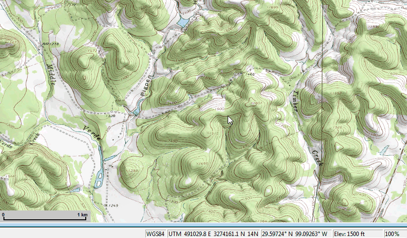 In the above screenshot the DEM layer is displayed with 30% opacity above a USGS topographic map (DRG) to provide a shaded effect. The 100% indicated on the status line, therefore, applies to the DEM layer's zoom level. The corresponding zoom level of the underlying DRG is about 38%.