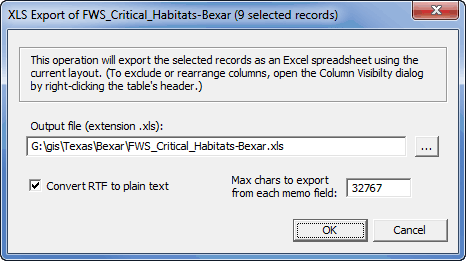 Within table views another export option, Export to Excel spreadsheet, is presented in the table's context menu. This can be useful when you don't want to distribute precise location data. Also, if the recipient's GIS software doesn't support memo fields, an XLS spreadsheet might be more useful than a shapefile since it can store up to 32K characters in a cell. The fixed-length character fields of typical shapefiles are limited to 254 characters.