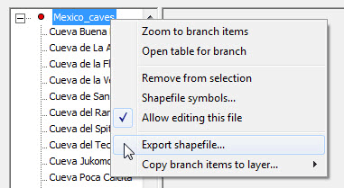 The shapefile export dialog can be accessed in several different ways. An entire shapefile can be exported by selecting its layer in the Layers window and clicking the "Export" button on the right panel. A more flexible approach, however, is to click the "Open Table" button on that panel. A selected subset of records, possibly with fields reordered and certain fields excluded, can then be exported by right-clicking one of the highlighted records and choosing Export shapefile from the context menu. Finally, you can load a group of features into the Selected Points window (say by text search or by dragging a rectangle on the map), then select either Export shapefile (for a direct export) or Open table for branch from the branch's context menu: