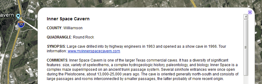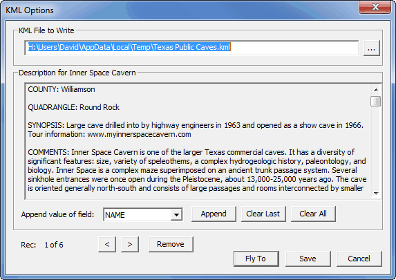 Note that in this example the COMMENTS field is included in the KML, which for this particular project would likely be a poor choice. A large report can cause too long of a delay after the click and before the description window appears. Also, the dialog itself doesn't yet provide a way to modify the descriptions. For now we can only choose the fields that will be included and preview the result.
