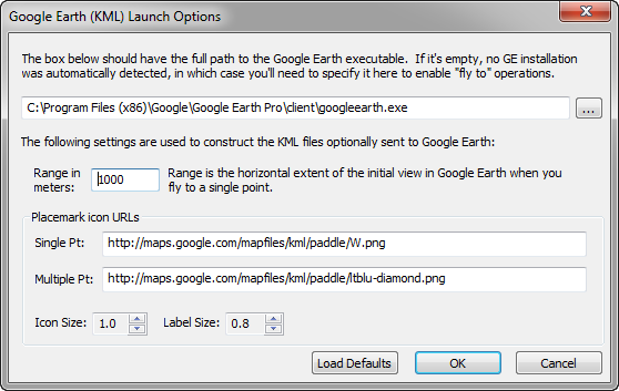 The KML file will contain one of the specified placemark icon URLs, the particular one used depending on whether or not multiple points are being exported. This could be made more flexible, but at least having two separate icons allows us to fly to a temporary point that's easily distinguishable from dozens of placemarks we may have exported earlier as a group. (The icon for a loaded KML file is also easily changed within GE itself.) The default URLs shown above should work with any KML viewing application as long as the URLs remain valid.
