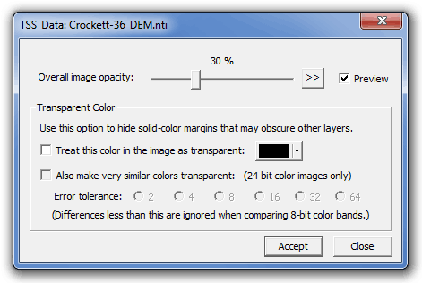 When the the Preview box is checked, the screen map will dynamically reflect your changes as you make adjustments. To actually change the layer's settings, however, you must click the Accept button before closing the dialog or invoking it for a different image. When adjusting opacity, you may want to uncheck the Preview box to suppress the dynamic map updating. Then, by toggling the checkbox, you can more easily compare the potential appearance with the one last accepted.