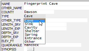 •A record can be assigned only one basic feature type (see above image), even though a cave or shelter can also be a spring. For indicating that a spring is present, there is a Yes/No field in the shapefile named HAS_SPRING. •The database has some records (about 4% in 2014) for which the karst type is unknown or was never specified. Those are indicated by a question mark appended to a guessed type name, such as "Cave?." While the question marks don't affect shapefile assignment, the County Karst Totals page on the TSS website will list the counts of such features under the "Undefined" column heading. •Cave systems will normally be represented by a single Cave record for a chosen primary entrance and one or more separate Entrance records for the remaining entrances. The TSS_Data project has a shapefile named TSS Caves that includes both Cave and Entrance records. •Small solution pockets, enlarged fractures, conduits in cliff faces, and similar structures were never considered sinks, so several years ago Cavity was added to the list of basic karst types. Since Sinks and Cavities are features of roughly similar importance when compared to the other types, we've placed them both in a shapefile named TSS Sinks and Cavities. This makes it easier to toggle their appearance in WallsMap and to exclude them from searches when appropriate. Entrances are included with Caves in the TSS Caves shapefile for much the same reason. •The OTHER_TYPE field (30 characters) can be used to further describe the type of feature. It should always be used when the basic type chosen is "Other." For cavities also, we would want to use it to indicate the type of cavity. •Currently about 4% of the records in the database originally never had a definite type assignment. In the TYPE field, therefore, you might see "Cave?", the question mark indicating uncertainty. •In WallsMap, these definitions appear in a pop-up window when the mouse pointer hovers over the field name (TYPE). The program retrieves them from a custom shapefile component, a text file with with extension .tmpshp. The other fields also have these pop-up "tool tips" to indicate what kinds of values are expected.