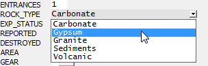 .FLD ROCK_TYPE C 30 << ROCK_TYPE ?(|Carbonate|Gypsum|Granite|Sediments|Volcanic|,1)