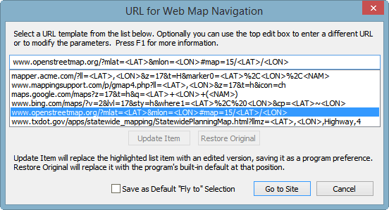 One of six suggested URL templates, all of which are customizable, can be selected from the list. You might then modify the parameter values that determine initial zoom level and type of map. For example, the first four templates, if unedited, will request a street-labeled aerial (hybrid) map at zoom level 17. Here we've chosen the OpenStreetMap URL without editing it. At this point we can launch our browser with the selected URL. If the Save as Default... box is checked, the selected list item is saved as the default for future fly-to operations. During the program session the edits to that item will also be maintained.