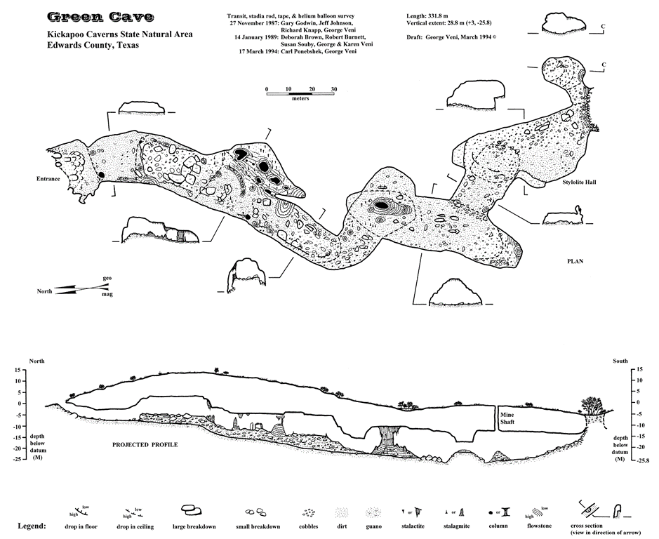 Description: Stuart Cave (formerly known as Green Cave - see map) is a single, 332-m-long passage that averages 20 m wide by 8 m high. It contains a world of guano and gnats. The cave begins as a steep, slippery ramp, leading down into a 17 m wide by 6 m high passage. Passage dimensions begin to change almost immediately and vary throughout the length of the cave; heights range from 1.8 to 14.6 m and widths from 7 to 18 m. The passage is seldom less than huge. Much of the cave floor is covered with breakdown and bat guano. Massive columns and other speleothems occur throughout the cave, although most are stained and partially covered by guano. A decorated and relatively guano-free alcove can be found about 80 m into the cave. Some modest but clean stalactites occur in the room at the end of the cave. Stuart Bat Cave has been known since the 19th century, but most visits were side trips from its more popular and famous neighbor, Kickapoo Cavern. Consequently little historical information has been recorded on this overshadowed cave. The cave was mined for guano for many years up to at least 1957. Miners dug a shaft from the surface into Stylolite Hall near the back of the cave. It was covered by the Texas Parks and Wildlife Department (TPWD) in 1989 to return the cave to its natural state and encourage growth of the bat colony. A few artifacts from the mining remain in Stuart. The cave's bat colony is mostly comprised of the Mexican Free-tail Tadarida brasiliensis mexicana. Since TPWD's covering of the shaft entrance the bat population has noticeably increased and is estimated at 500,000. However, the present cover on the shaft is temporary, and an air-tight cover is planned, which would increase the cave's temperature making it more suitable for a maternity colony. Besides the bats, other flying creatures which inhabit the cave include bees and cave swallows (Hirundo fulva pallida) which nest near the entrance, and several million gnats which swarm through the cave during the months the bats are present. The invertebrate fauna has not been well investigated but preliminary collections yield a typical array of guanophiles. The twilight zone contains Rhadine howdeni, a fast-moving reddish, ant-like beetle. Stuart Bat Cave formed by slow-circulating phreatic groundwater (water contained in and flowing through rock aquifers) which dissolved open large passages within the Devils River Limestone. As the regional water table declined, water drained from the cave, and its ceiling began to collapse into a more structurally stable configuration. The only intact portion of phreatic passage is at the base of the entrance ramp. The downcutting of surface valleys (when surface rock is dissolved away through the effects of wind, rain, and/or flowing water) has twice intersected the cave, once to form its entrance and once at its opposite end to block-off further exploration. Although some of the cave's smaller speleothems are relatively new, dating of the large speleothems indicate their most recent deposits are about 256,000 years old, and most are older than 350,000 years. The last big room in the cave, Stylolite Hall is named for a type of geologic feature seldom seen in Texas caves. Stylolites are bedrock solution features unrelated to the cave's development, which appear in place of bedding planes as undulating to spiked lines. They are best seen in the northwest corner of the room near the terminal breakdown. Bibliography: Smith, A. R., and J. R. Reddell. 1965. The caves of Kinney County. Texas Speleol. Surv., 2(7):11,13,14. Stuart, D. K. 1993. Personal communication. Superintendent of Kickapoo Caverns and Devil's Sinkhole State Natural areas. Veni, G. 1992. An introduction to the age of Texas caves. Texas Caver, 37(5):82-83; reprinted in GEO², 1992, 20(10):3-4 and cover. Wahl, R. 1988. Personal communication. Austin, Texas. Revised 7/2014; original page author: George Veni. All rights reserved. |